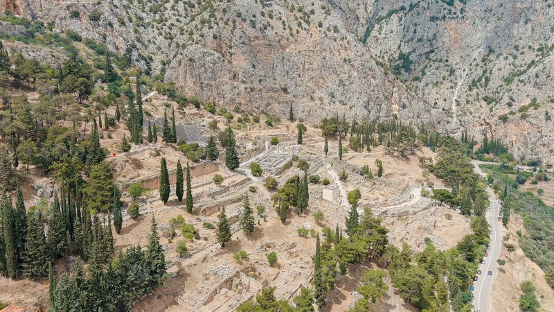 Делфи, Греция.Руины древнего города Дельфы.Солнечная погода, лето, вид с воздуха