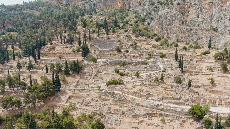 Делфи, Греция.Руины древнего города Дельфы.Солнечная погода, лето, вид с воздуха