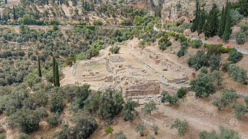 Делфи, Греция.Руины древнего города Дельфы.Солнечная погода, лето, вид с воздуха
