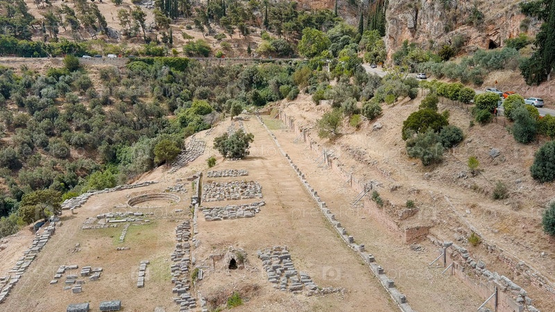 Делфи, Греция.Руины древнего города Дельфы.Солнечная погода, лето, вид с воздуха