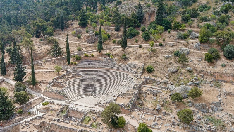 Делфи, Греция.Руины древнего города Дельфы.Солнечная погода, лето, вид с воздуха