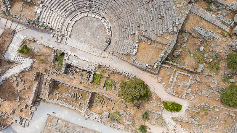 Делфи, Греция.Руины древнего города Дельфы.Солнечная погода, лето, вид с воздуха