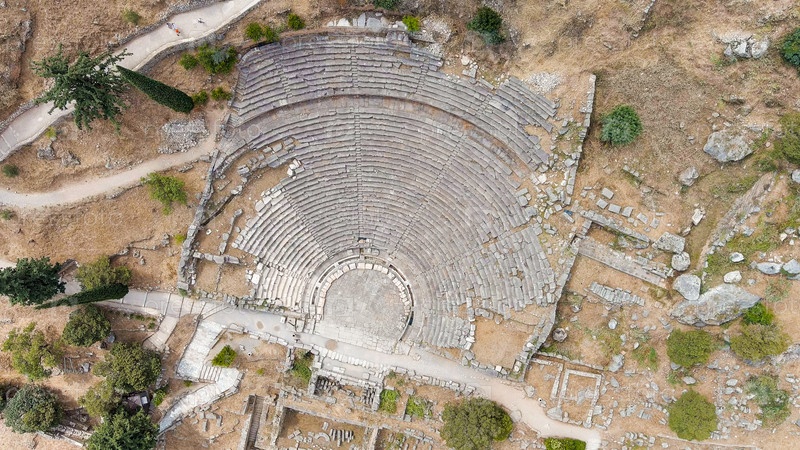 Делфи, Греция.Руины древнего города Дельфы.Солнечная погода, лето, вид с воздуха