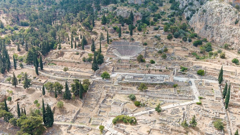 Делфи, Греция.Руины древнего города Дельфы.Солнечная погода, лето, вид с воздуха