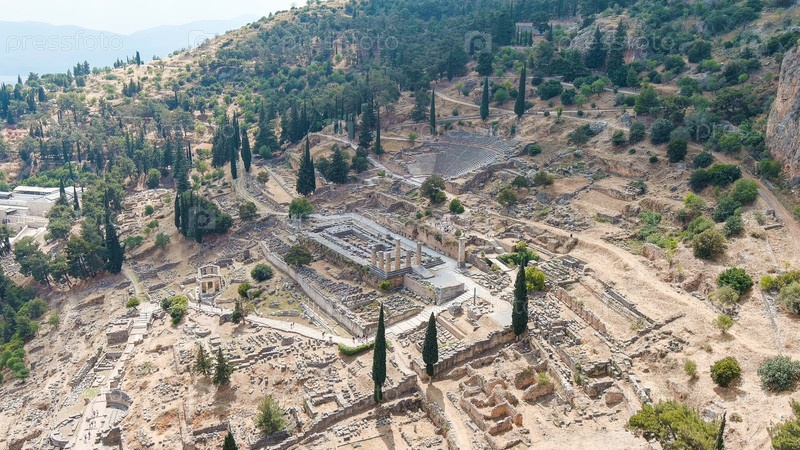 Делфи, Греция.Руины древнего города Дельфы.Солнечная погода, лето, вид с воздуха