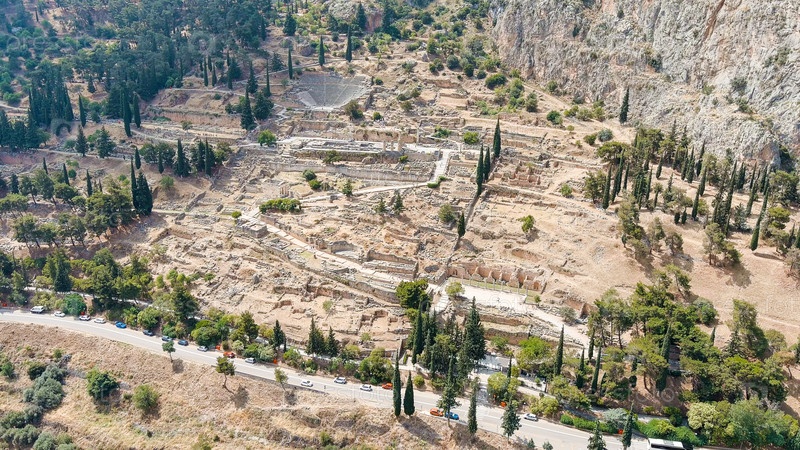 Делфи, Греция.Руины древнего города Дельфы.Солнечная погода, лето, вид с воздуха