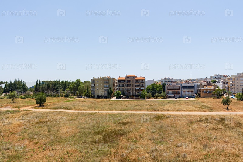 Александруполис, Греция Дома на окраине города перед полем с сорняками Лето