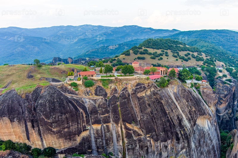 Мегала-Метеора - Великий метеорный монастырь. Панорама высоких скал и гор с монастырями. Доброе утро. Вид с воздуха