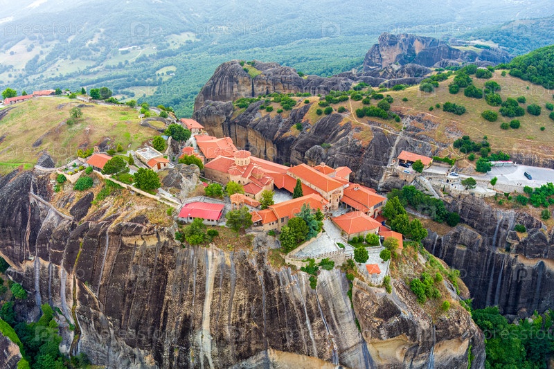 Мегала-Метеора - Великий метеорный монастырь. Панорама высоких скал и гор с монастырями. Доброе утро. Вид с воздуха