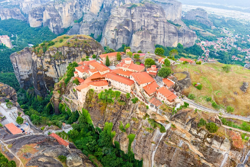 Мегала-Метеора - Великий метеорный монастырь. Панорама высоких скал и гор с монастырями. Доброе утро. Вид с воздуха