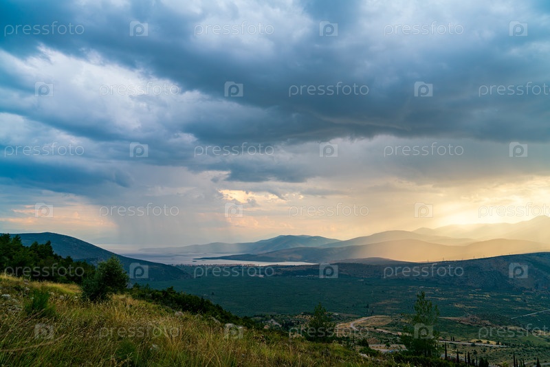 Дельфы, Греция.Облака дождя над долиной.Когда солнце садится, облака проясняются и наступает ночь.Северное побережье Коринфского залива, бухта Итеи