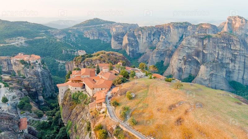 Метеора, Калабака, Греция. монастырь Преображения Спасителя. метеоры - это скалы высотой до 600 метров. ЮНЕСКО перечисляет 6 активных греческих православных монастырей Посмотреть с воздуха