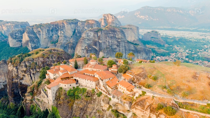 Метеора, Калабака, Греция. монастырь Преображения Спасителя. метеоры - это скалы высотой до 600 метров. ЮНЕСКО перечисляет 6 активных греческих православных монастырей Посмотреть с воздуха