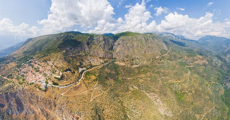 Делфы, Греция.Руины древнего города Дельфи и современного города.Вид на долину.Солнечная погода.Воздушный вид