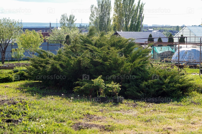 Огромный раскинувшийся можжевельник казак (Juniperus sabina) на фоне сада и зданий