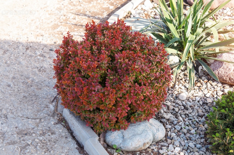 Красная шарообразная карликовая барberry Thunberg (berberis thunbergii) Багателла в составе камней и других декоративных растений