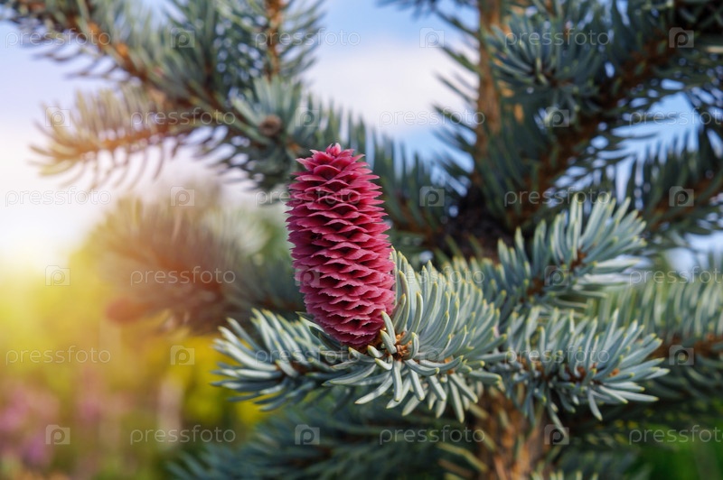 Яркий розовый выпуклость на ветвях голубой елей Picea asperata (грубая ель)