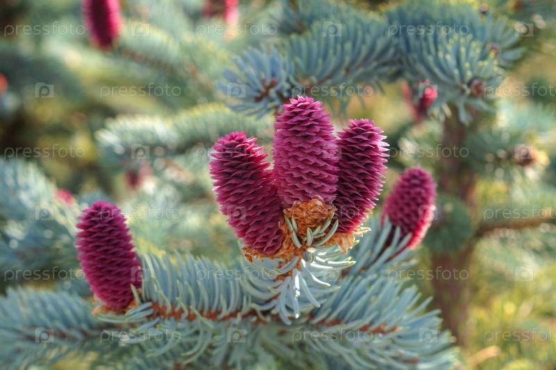 Большие розовые шишки на ветвях голубой елей Picea asperata (грубая ель)