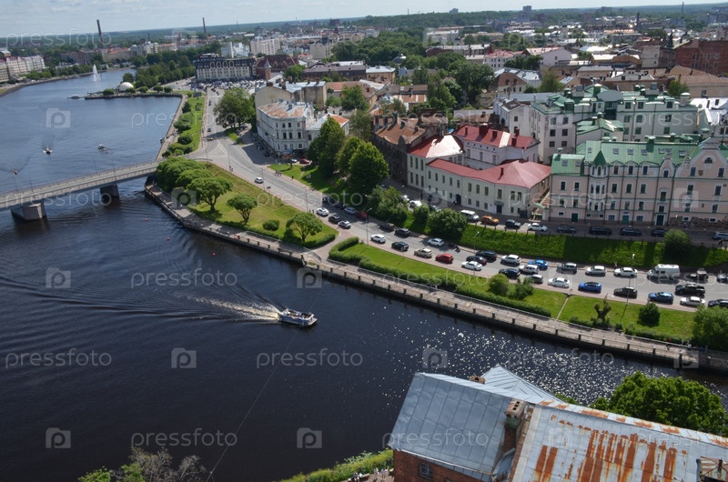 Вид на историческую часть средневекового города Выборга с смотровой площадки башни Святого Олафа из Выборгского замка: Северная гавань, Петровский мост