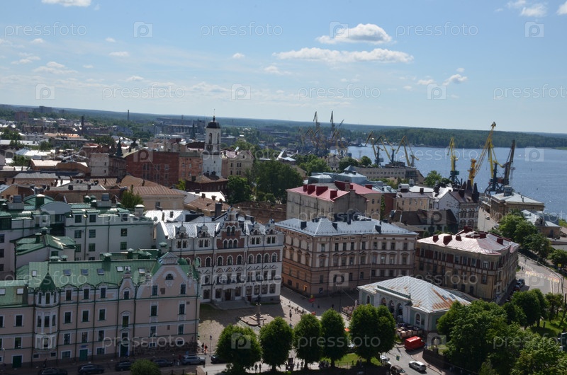 Вид на средневековый город Выборг с смотровой площадки башни Святого Олафа: Часовая башня, Старая ратуша и морской торговый порт
