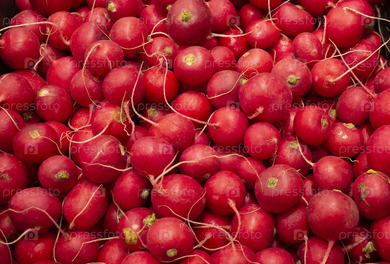 Свежие красные редисы, лежащие в коробках супермаркета, на рынке.Концепция экологических продуктов, здоровья, сельскохозяйственных культур и неурожайности в стране