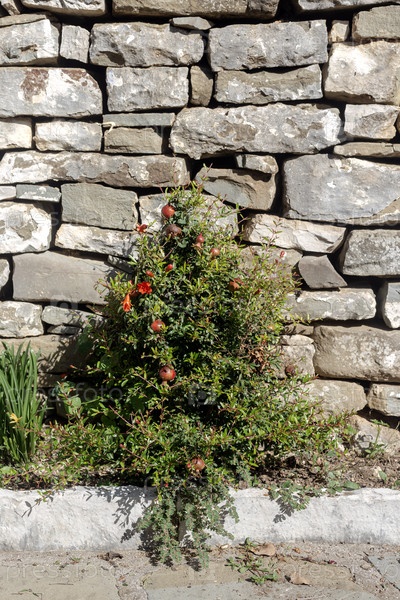 Небольшой куст декоративного граната с красными цветами и плодами на близком расстоянии