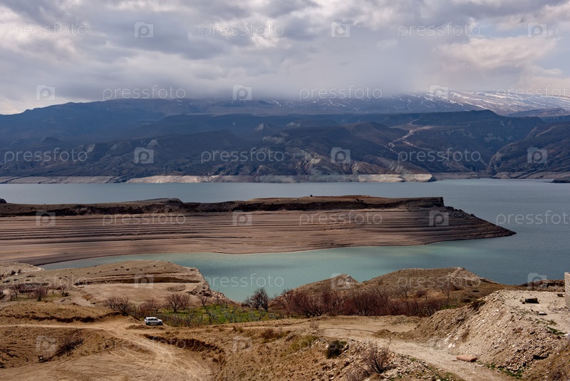 Оукки, Россия. 3 апреля 2021 года Живописный вид на водохранилище на реке Сулак в горах Северного Кавказа