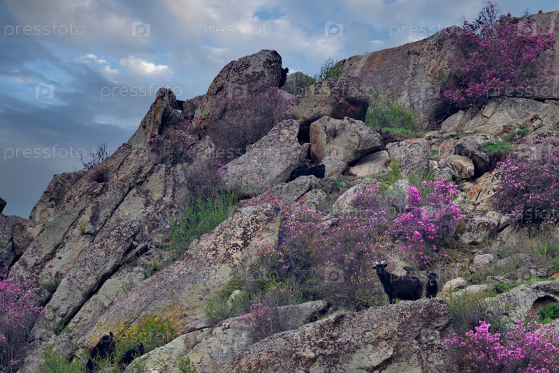 Россия. Юг Западной Сибири. Алтайские горы. Небольшое стадо коз прыгает по скалам, окруженным цветущими рододендронами