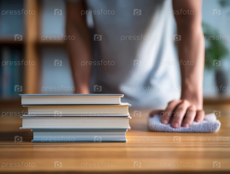 Мальчик убирает стол рядом со стопкой книг