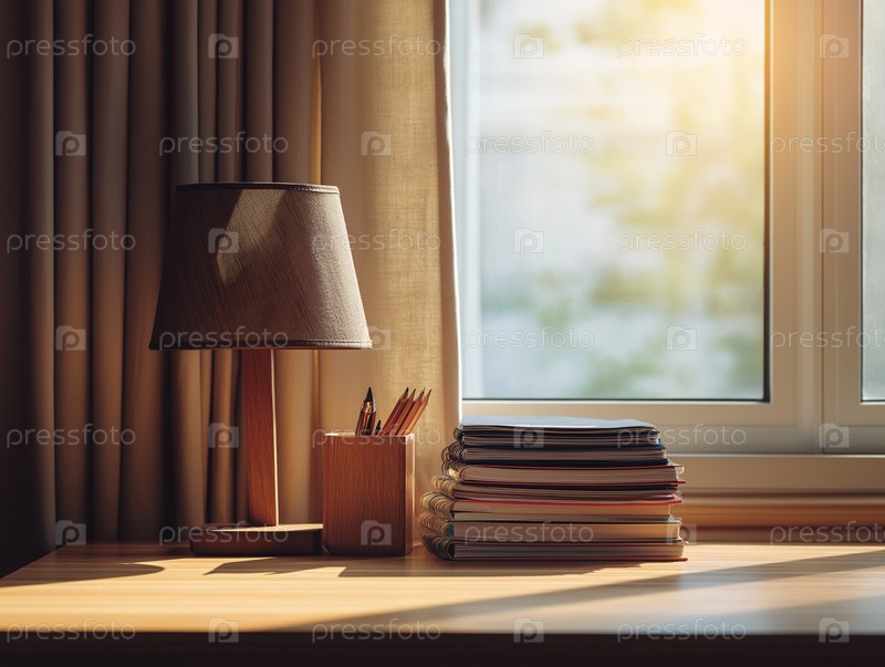 Стол у окна с лампой, карандашами и аккуратной кучей тетрадей