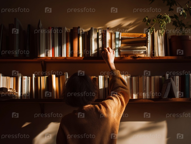 Девушка тянется за книгой на полке в библиотеке