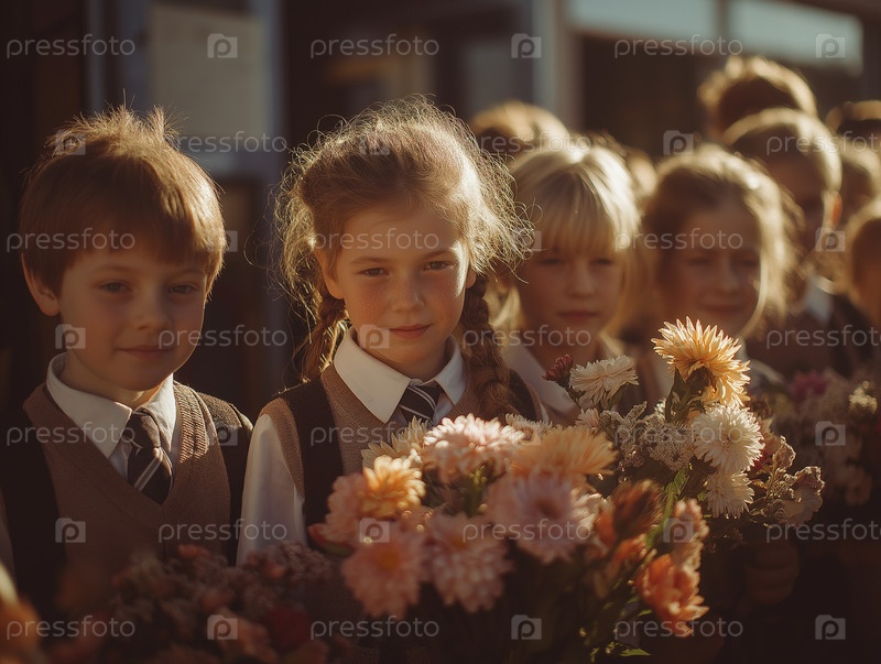 Дети с цветами в школьной форме