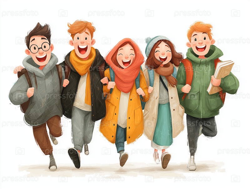 Иллюстрация пяти подростков, бегущих вперед, смеющихся и цепляющихся друг за друга.Они носят зимние куртки, шарфы и рюкзаки.Атмосфера движения и веселья