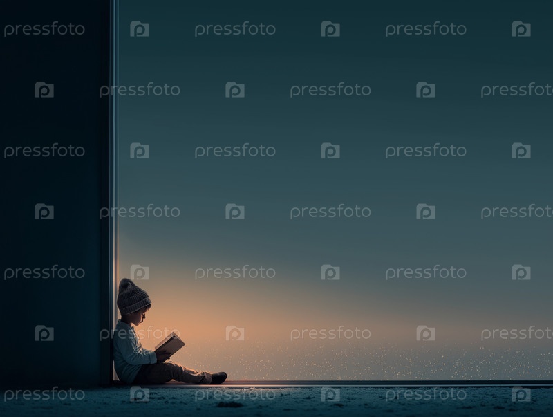Маленький ребенок в вязанной шляпе сидит у двери и читает книгу. Перед ним открывается ночной пейзаж с огнями на расстоянии. Атмосфера комфорта, тишины и погружения в чтение