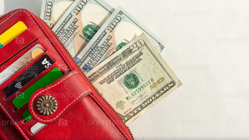 100-долларовые купюры. Деньги у меня в кармане. Стодолларовые банкноты. Американская валюта. В красной сумочке