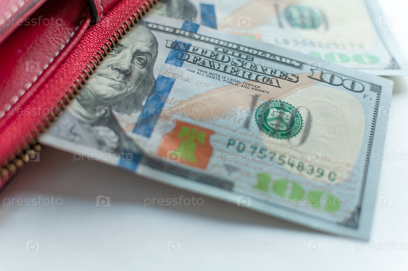 100-долларовые купюры. Деньги у меня в кармане. Стодолларовые банкноты. Американская валюта. В красной сумочке