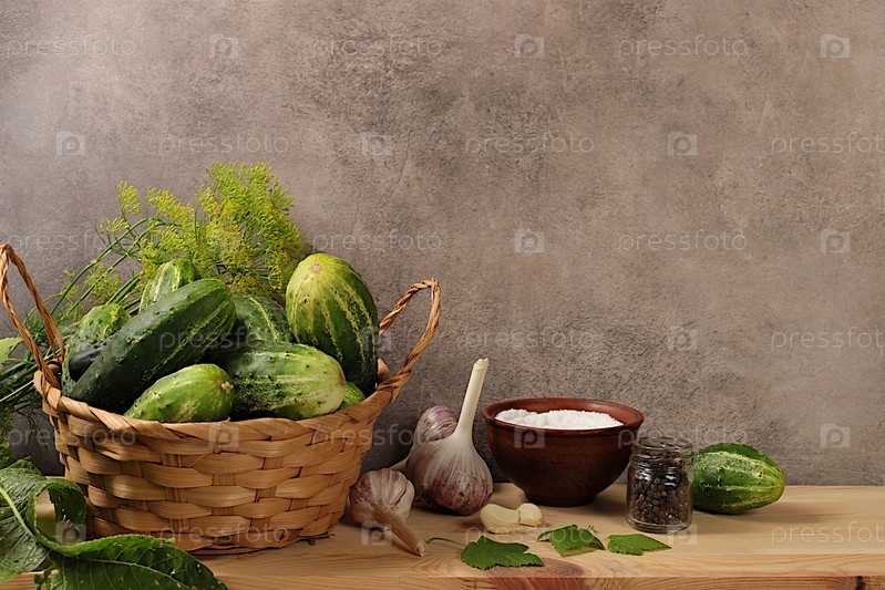 Свежие огурцы в корзине, специи, чеснок и листья на бетонном столе, урожай деревни, домашний рецепт маринования, огурцы и ингредиенты для мариновки, концепция консервирования дома, здоровая и натуральная пища