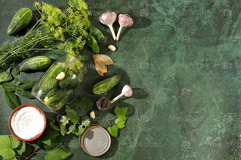 Рецепт домашнего маринования, огурцы и ингредиенты для мариновки, огурцы в банках с чесноком и укропом на деревянном кухонном столе, рустический стиль, концепция консервирования дома