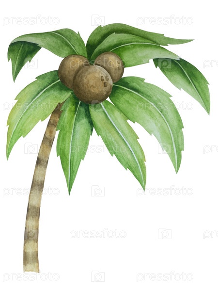 Акварель ручной живописи летнего пляжа с предметами прибрежного курорта, такими как пальма, зонтик на берегу моря, коктейли, ракушки, солнцезащитные очки, шляпа и цветы