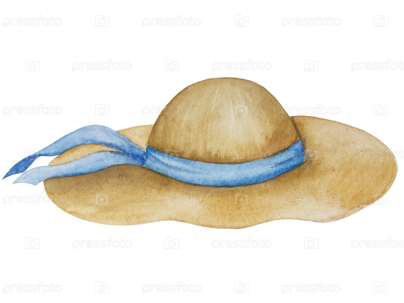 Акварель ручной живописи летнего пляжа с предметами прибрежного курорта, такими как пальма, зонтик на берегу моря, коктейли, ракушки, солнцезащитные очки, шляпа и цветы