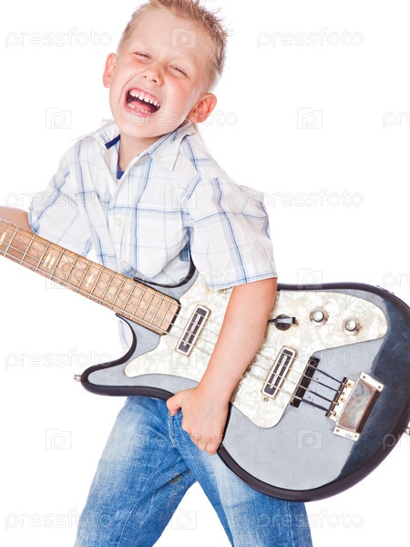 Мальчик с гитарой на белом фоне