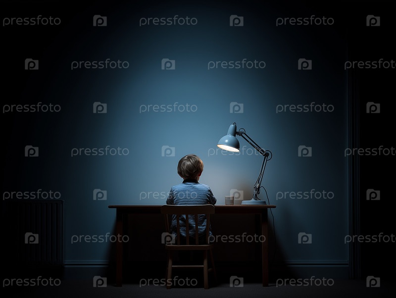 Мальчик сидит один за столом с настольной лампой