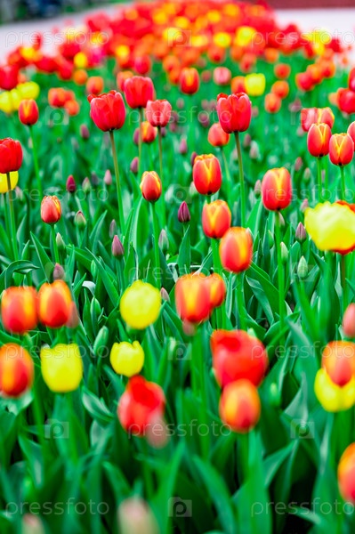 Красно-желтые тюльпаны в цвете