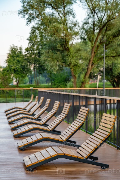 Пустые влажные деревянные стулья на открытой палубе