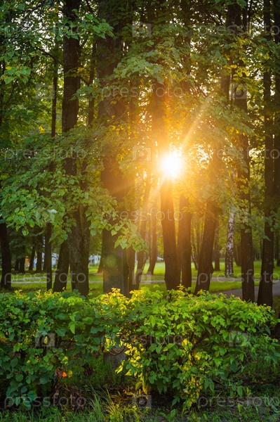 Восход солнца прорывается сквозь деревья в пышном парке