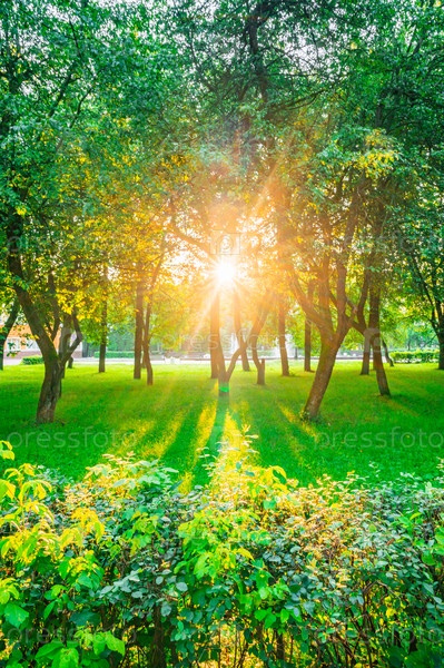 Восход солнца прорывается сквозь деревья в пышном парке