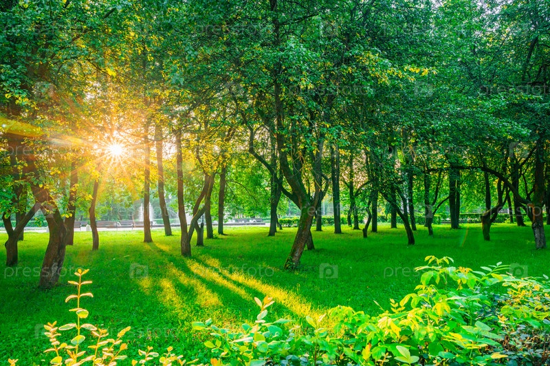 Восход солнца прорывается сквозь деревья в пышном парке