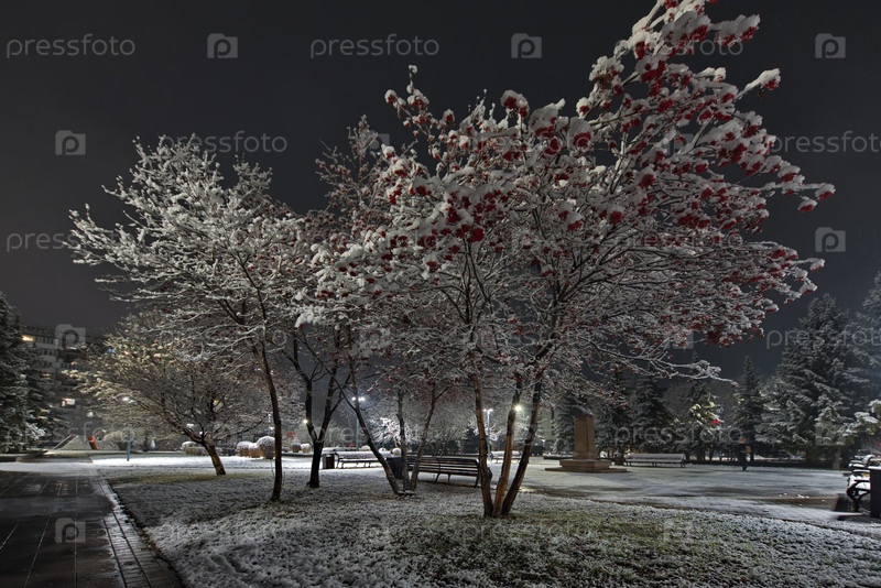 Новокузнецк, Россия. 1 ноября 2024. живописный вид на деревья городского парка, покрытые первым осенним снегом и освещенные фонарями холодного света