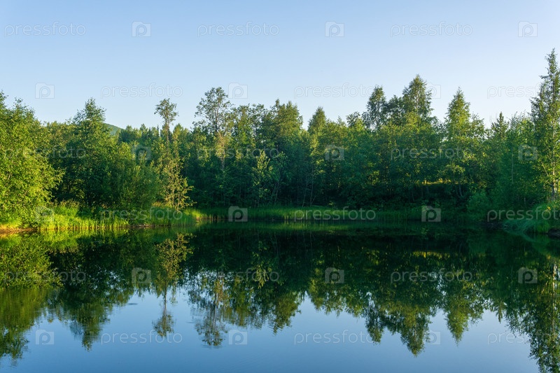 Красивый летний пейзаж с лесным озером и отражением деревьев в воде