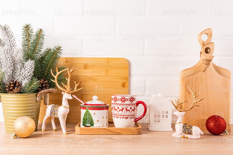 Мог и сахарная миска с новогодним орнаментом на кухне деревянный столешничный стол с украшениями для Нового года и Рождества